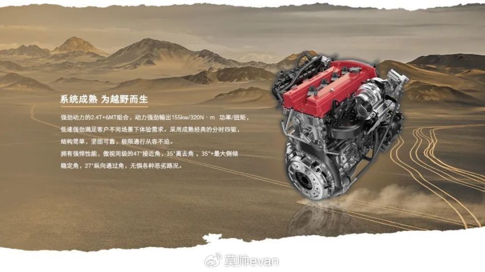 动力方面,搭载来自沈阳航天三菱的4K22D4T 2.4升汽油涡轮增压发动机,最大功率为155千瓦,峰值扭矩为320牛·米,传动系统方面,匹配6速手动变速箱。底盘方面,采用与北汽制造勇士(配置|询价)军车同款的前悬架为双纵臂螺旋弹簧非独立悬架,后悬架为5片钢板弹簧非独立悬架。越野硬件上,采用分时四驱系统、后桥差速锁、循环球转向机。更多新车资讯,购车行情,欢迎留言互动。(图:来源网络;文:懂车之道 李伟 编辑)