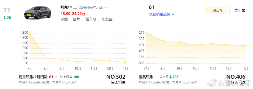该车基于奥特能平台打造,是上汽通用最新的纯电平台,被上汽通用寄予厚望!但现实情况却是“上市前雷声大,上市后雨点小”,在该车首个交付月时,月销达到了1700多辆,但后面月销仅200辆左右,最新的交付月显示,别克E4在整个1月份仅销售了61辆车!