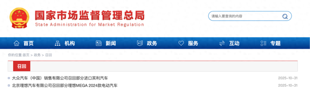 召回编号S2025M0174V:自2025年11月7日起,召回生产日期从2024年2月18日至2024年12月27日的理想MEGA 2024款汽车,共计11411辆。