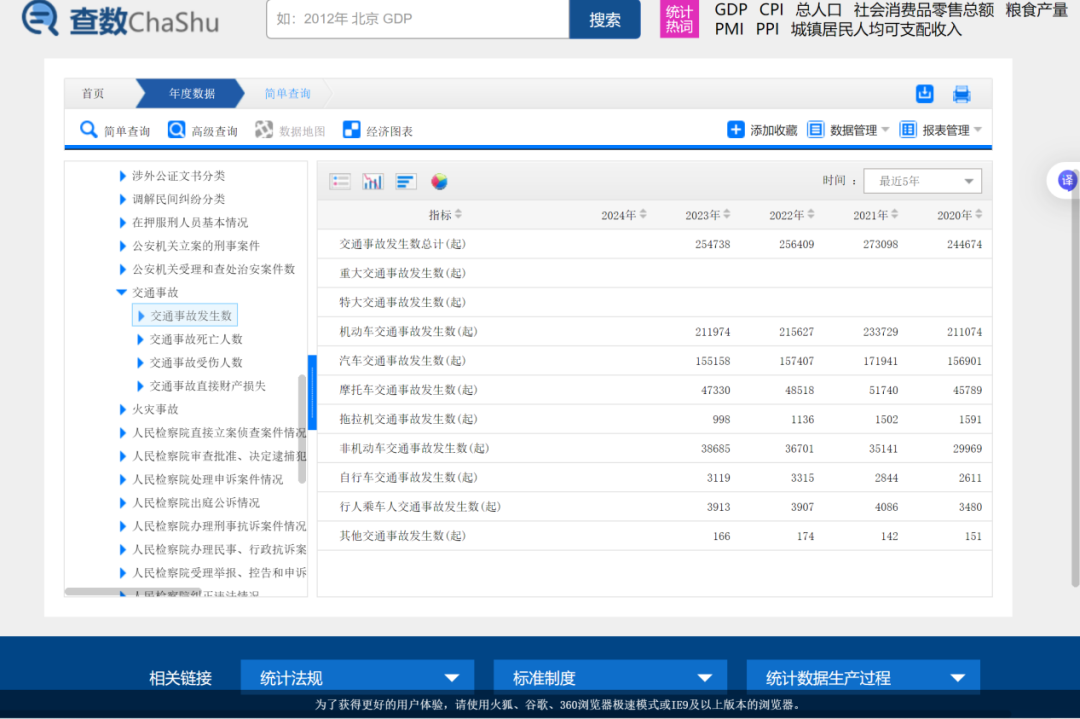 在国内大环境下,我认为比较现实的情况是,赶紧鞭策国家统计局把相关的数据做得更精细化一些。其实大家可以去他们的官网看看,他们有按“交通事故发生数”、“交通事故死亡人数”、“交通事故受伤人数”、“交通事故直接财产损失”来做统计。