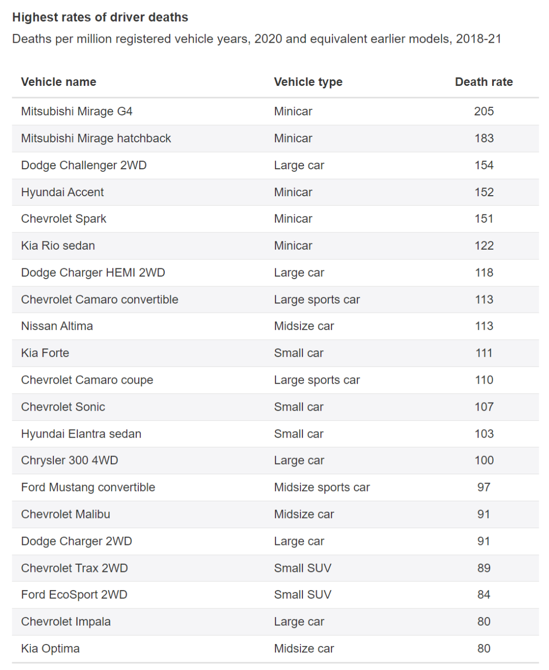 这些数据不是“谁更差”的排行榜,目的是帮助消费者、保险行业、车企理解现实世界风险差异。所以大家能看到Mirage、Dodge Challenge、Spark这种 minicar 长期霸榜常年霸榜的主要是小车,反而大型豪华车长期死亡率极低。