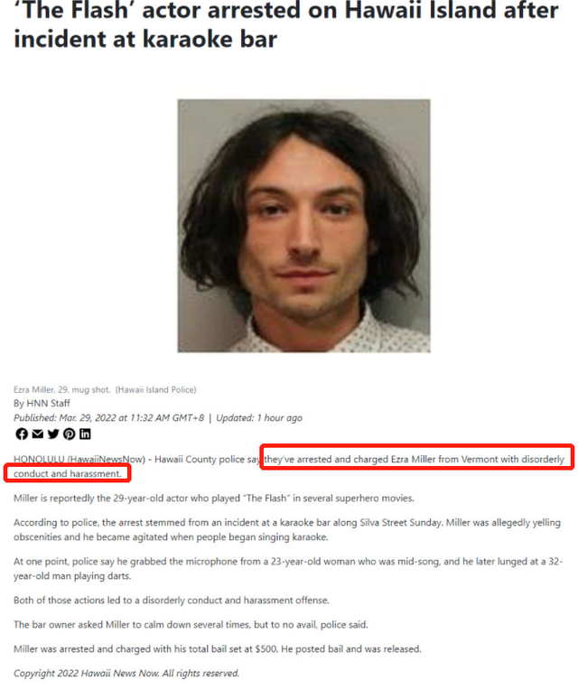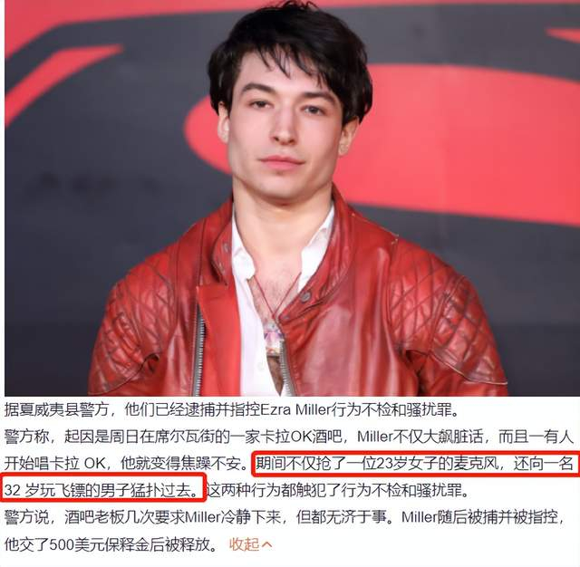 当天Ezra Miller在一家卡拉OK酒吧玩,在那期间Ezra Miller一直大飙脏话,并且在有人唱歌时,他便会显得焦躁不安。随后Ezra Miller便做出了一系列让人无法理解的行为,他抢走了一名女子的麦克风,并且猛扑了一名玩飞镖的男子。酒吧老板劝导后并无效果,后来Ezra Miller便被捕并被指控。