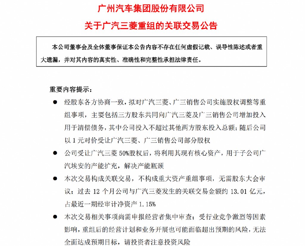 简单来讲,就是广汽集团将以1元的价格收购广汽三菱以及销售公司的股份,并且成为其全资子公司,而广汽三菱的工厂未来会交由广汽埃安来扩充产能。