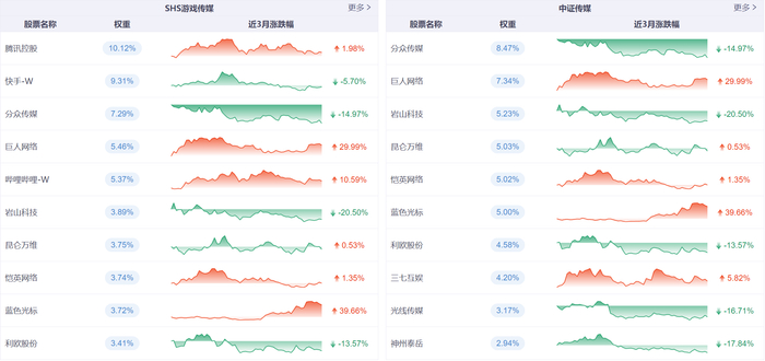 指数方面,如果想要着重看国内传媒领域可以看看中证传媒指数,游戏、广告、影视等板块在该指数中长期占较大比重。如果想看A、H股综合市场,那可以看SHS游戏传媒指数,该指数中囊括快手、腾讯等港股游戏娱乐巨头,这也让一种想要投资港股游戏产业的投资者有的新的方向。与此同时,成分股不仅覆盖游戏,还带影视、出版等“防御型”细分赛道。
