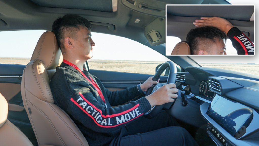 以我183cm/90kg的身材体验,将前排座椅调至舒适的驾驶坐姿并放置最低后,我的头顶距离天窗遮阳帘还有4指的余量。
