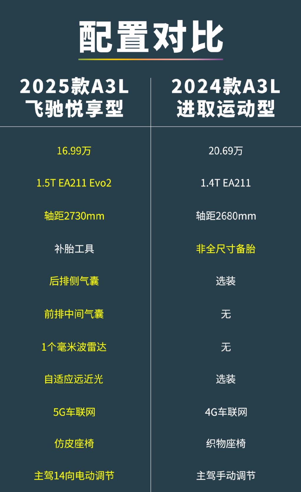 最后,我们来聊聊价格和性价比。在售价部分,新款A3依旧提供两厢Sportback和三厢Limousine版本,其中两厢为标轴,三厢为加长100mm的长轴。其中,两厢版有2款配置,售价分别为16.59、18.99万元;三厢版同样有2款配置,售价分别为16.99、19.39万元。同时,无论是两厢还是三厢版本,均提供一个1.6万元的【豪华臻选包】可供选装。