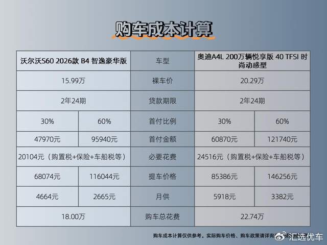 那对比同级车型,买沃尔沃S60到底能省多少钱呢?下面我们就拿奥迪A4L(配置|询价)来对比一下。目前,奥迪A4L入门版裸车价在20.3万元左右,若支持2年免息贷款,首付30%(60870元),加上购置税、保险等必要费用,85386元便可提车,之后月供5918元;若选择首付60%(121740元),则提车总费用约为146256元,月供为3382元。两种方案,总落地价均在22.7万元左右,对比之下,买沃尔沃S60能直接省下4万多元,你就说香不香?当然了,小编在本文内展示的购车成本计算仅供大家参考,实际购车价格、购车政策还请详询当地授权经销商。