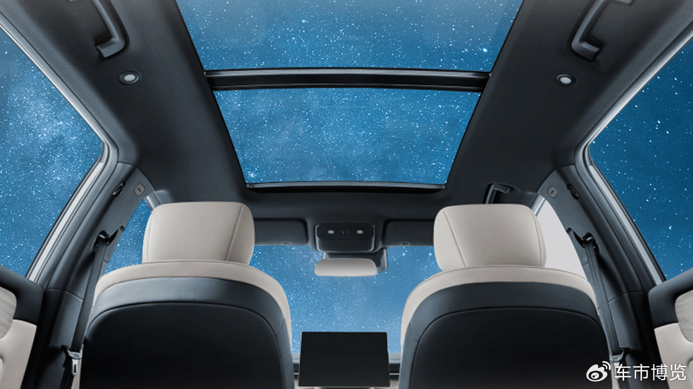 新车配备1362mm×870mm超大星河天窗,总面积超1.18㎡,可开启面积达0.6㎡。相比同级尺寸更大、透光性更好、车内视野更开阔、座舱更通透。