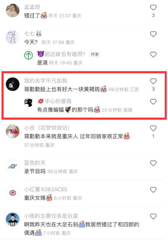有不少网友看到蒋勤勤的这几张生图,忍不住惊讶感叹:“蒋勤勤脸上也有好大一块黄褐斑”!“有点像蝙蝠的那个吗?”
