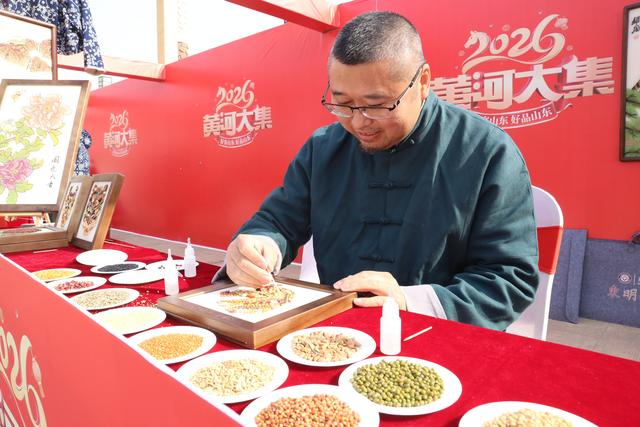 在“手艺”中触摸传承。菏泽手造与非遗展销区,堪称一场小型“非遗博览会”。曹县汉服衣袂飘飘,色泽明丽的鲁锦编织着古老技艺,刻瓷、面塑、牡丹瓷等令人叹为观止。东明粮画传承人韩国瑞的展位尤为引人注目。他以“马到成功”为主题,用红玉米、黑豆、草籽等三十余种天然作物种子,创作出气韵生动的马年系列粮画新作。“每一粒粮食都来自土地,每一幅画都寄托着对丰收、对美好生活的向往。”韩国瑞的话语,道出了非遗技艺背后深厚的乡土情结与生命哲理。在这里,古老手艺不再是博物馆里的陈列,而是活态传承、可带回家的“年礼”。