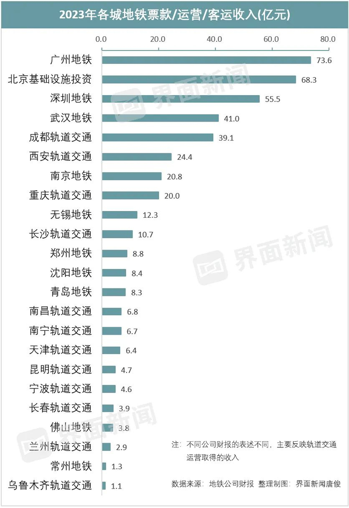 广州是地铁票务收入最高的城市,超过70亿元;京投和深圳地铁的票务收入超过50亿元。中国内地地铁票价相差不大,客流越高的城市票务收入越高。