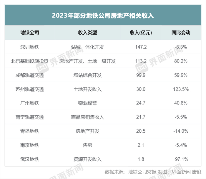 2023年房地产行业承压,部分地铁公司相关收入下降,但也有部分公司逆势上涨。