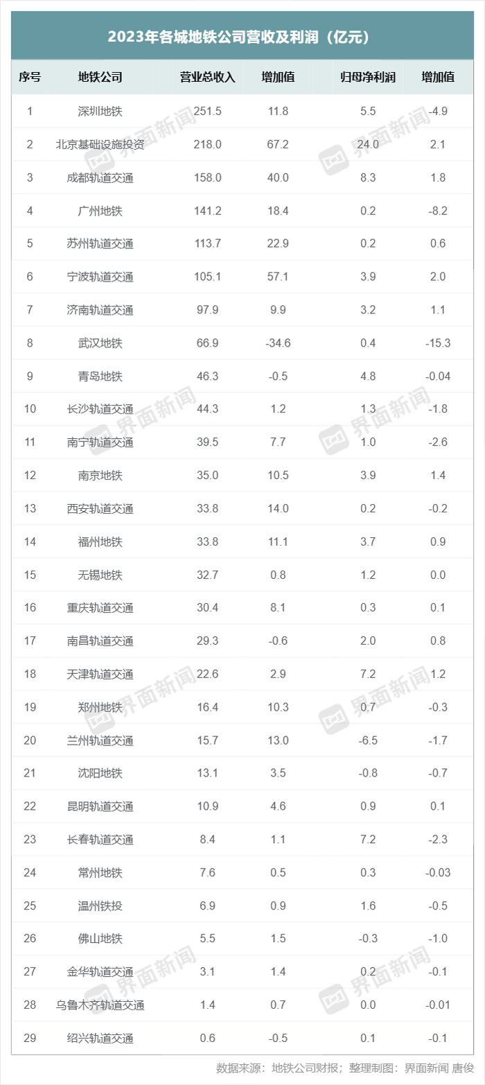 此外,苏州轨道交通、西安轨道交通、兰州轨道交通、福州地铁、南京地铁、郑州地铁的营收增加值也较高,均在10亿元以上。