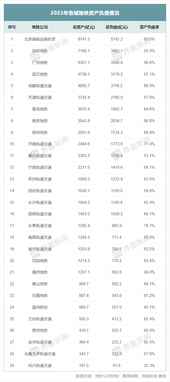 29城地铁总负债为4.3万亿元,如果加上其他没有公布财报的地铁公司,全国地铁行业的负债额更大。一个可以对比的数据是,国铁集团2023年末的总负债为6.13万亿元。