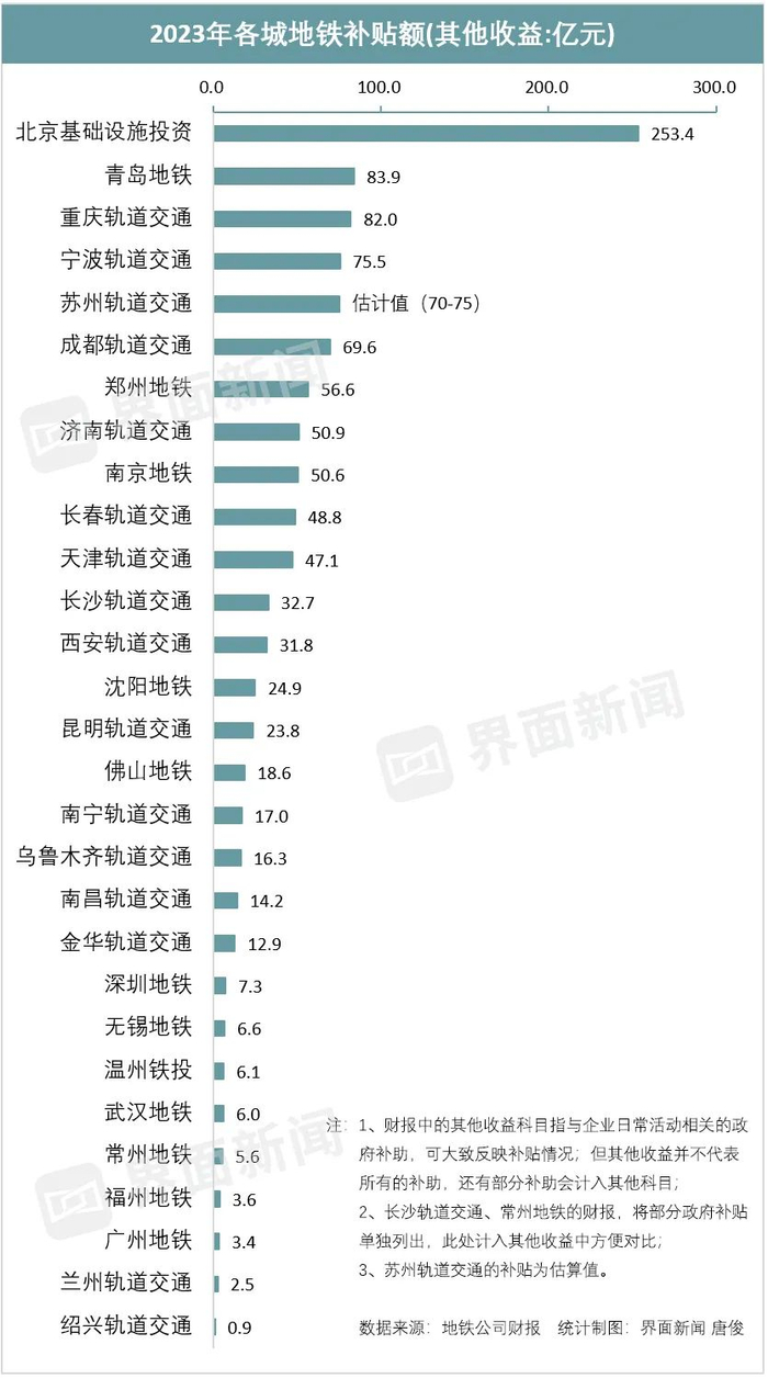 界面新闻统计29城地铁财报发现,有21家公司的“其他收益”上涨,其他收益是指与日常活动相关的政府补助。这些地铁公司获得的政府补助,总计约1000亿元。