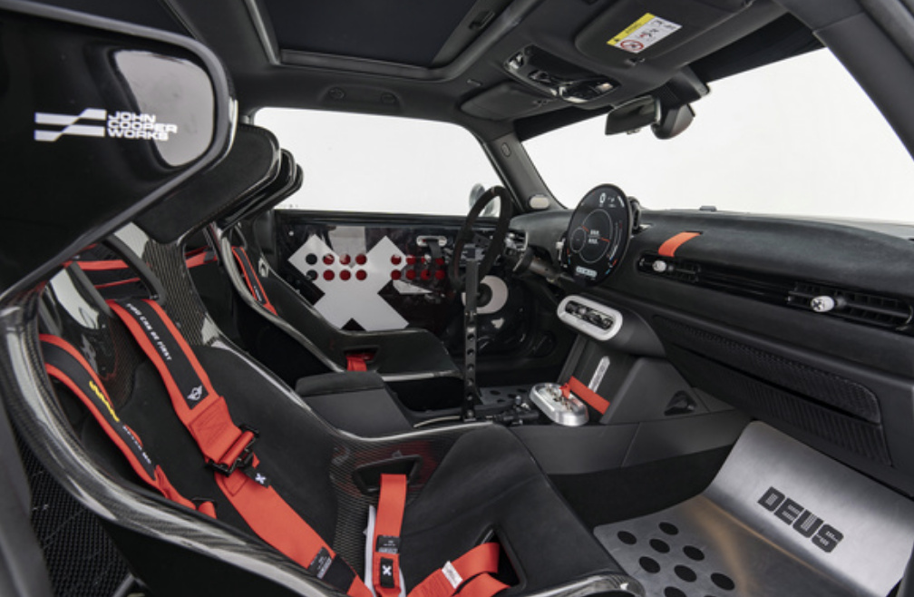 车内也是红、白、黑配色,保持了 MINI 家族圆形中控屏的布局。方向盘是三辐式赛车造型,铝合金踏板裸露在外,座椅是赛车桶形座椅,整个内饰就跟拉力赛车一样。配置方面,五点式安全带能在激烈驾驶时把驾驶者固定得更稳。
