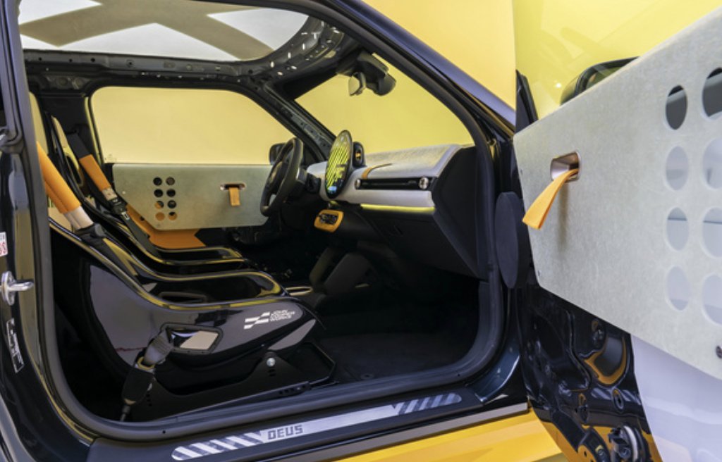 座椅是轻量化赛车桶椅,外面包着氯丁橡胶材质。潜水服常用这种材料,又柔软、又防水、还耐用,很适合在潮湿环境下用。对于这款和冲浪结合的车来说,用这种材料,既耐用,又契合主题。