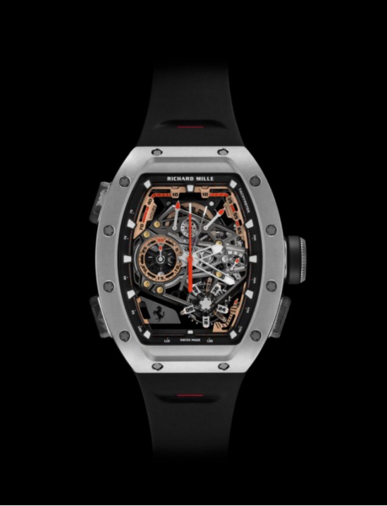 提起赛车,自然少不了最为人所熟知的F1。当RICHARD MILLE与F1老牌豪门法拉利相遇,便诞生了RM 43-01 Ferrari这款“腕间跑车”。表壳采用品牌专利的 Carbon TPT®碳纤维或五级钛合金材质,既延续了理查米尔标志性的轻量化与抗冲击特性,又呼应法拉利经典赛车涂装的视觉张力,而在钛合金底板上镭射雕刻“跃马(Cavallino)”标识,其形状灵感源自499P赛车的尾翼。镂空表盘以立体几何结构重塑法拉利V12引擎的机械美感,6点位悬浮陀飞轮如同跃马奔腾时的心脏,每一帧转动皆是对赛道精神的动态诠释。