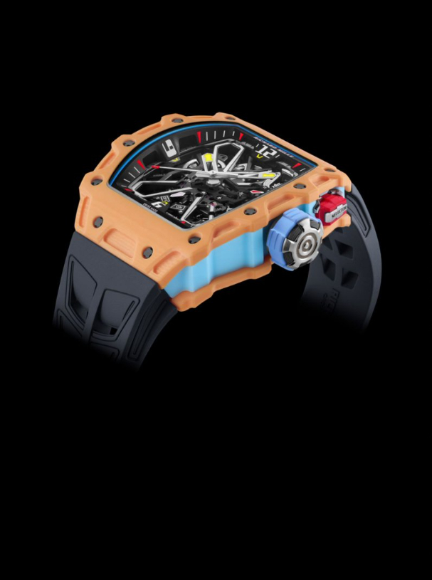 看似柔和的淡蓝与鲑鱼色,实则是RICHARD MILLE工艺难度最高的色彩之一,集中体现在RM 35-03腕表上。淡蓝色的灵感源自爱琴海的晴空,为了避免色彩过于“轻浮”,团队在颜料中加入微量的云母颗粒,让蓝色透出细腻的珠光,同时通过控制纤维层的压力,让色调呈现出“近看是浅蓝,远看带灰调”的微妙变化;而鲑鱼色则需要精准平衡橘色与粉色的比例——过多的橘色会显得艳丽,过多的粉色则会过于柔和,最终通过12次工艺迭代,才确定了最接近鲑鱼腹部的暖粉色调。更重要的是,这两种色彩的Quartz TPT®均保持了材质原有的抗冲击性能,真正实现了“柔美外观”与“强悍性能”的完美统一,恰如品牌“柔中带刚”的精神内核。