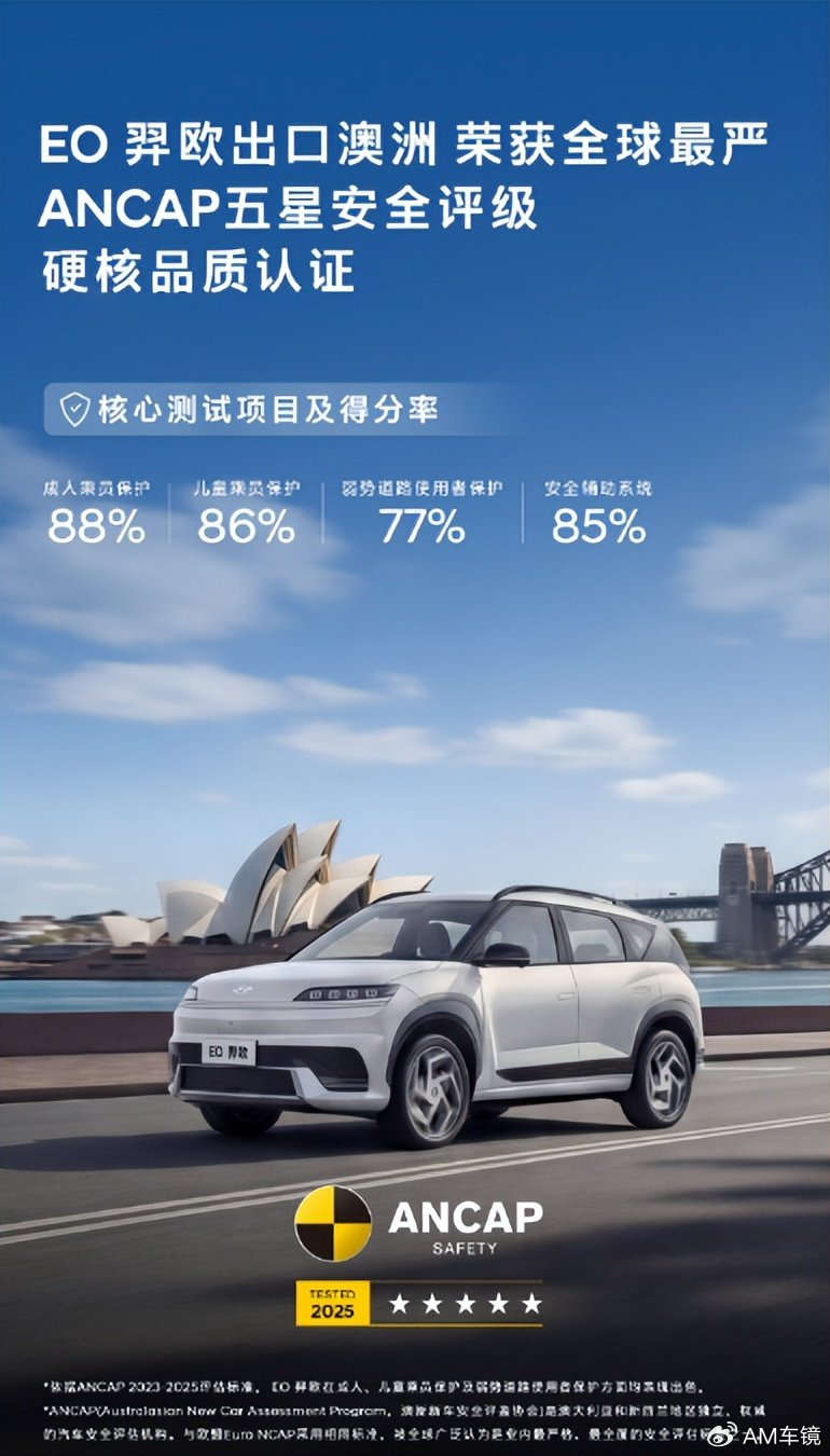 先给大家掰扯明白,这个ANCAP五星到底有多金贵。它和欧盟Euro NCAP用的是同一套标准,是全球公认最严苛的汽车安全测试之一,多少车企的出口车型都折在了这套测试里。这次EO羿欧面对的是20款参评纯电车型,直接凭硬实力击败了其中11款,四大核心维度全维度拉满:成人乘员保护得分88%、儿童乘员保护得分86%、安全辅助系统得分85%、弱势道路使用者保护得分77%,连ANCAP首席执行官都直言,这款车给了消费者十足的购买信心。