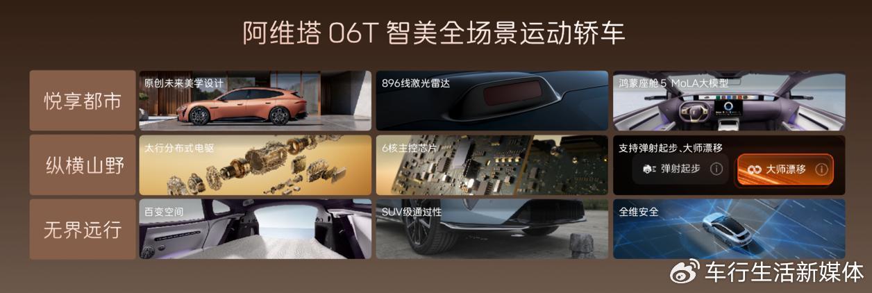 再来看阿维塔06T。预售价22.99万到27.99万,定位叫“智美全场景运动轿车”,翻译一下就是:既能跑得快,又能日常开得舒服。