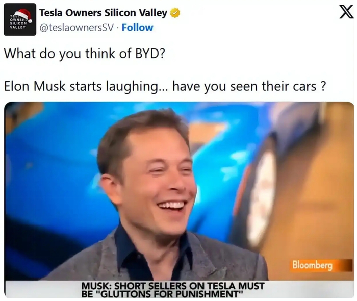 2011年10月,马斯克在接受彭博社采访时曾被问及比亚迪是否可能成为特斯拉的竞争对手。对此,马斯克先大笑并反问记者“你见过他们的车吗?”,轻蔑之意溢于言表。当记者追问时,马斯克进一步澄清说,他认为比亚迪的产品“并不特别吸引人”,技术“也不够强大”。