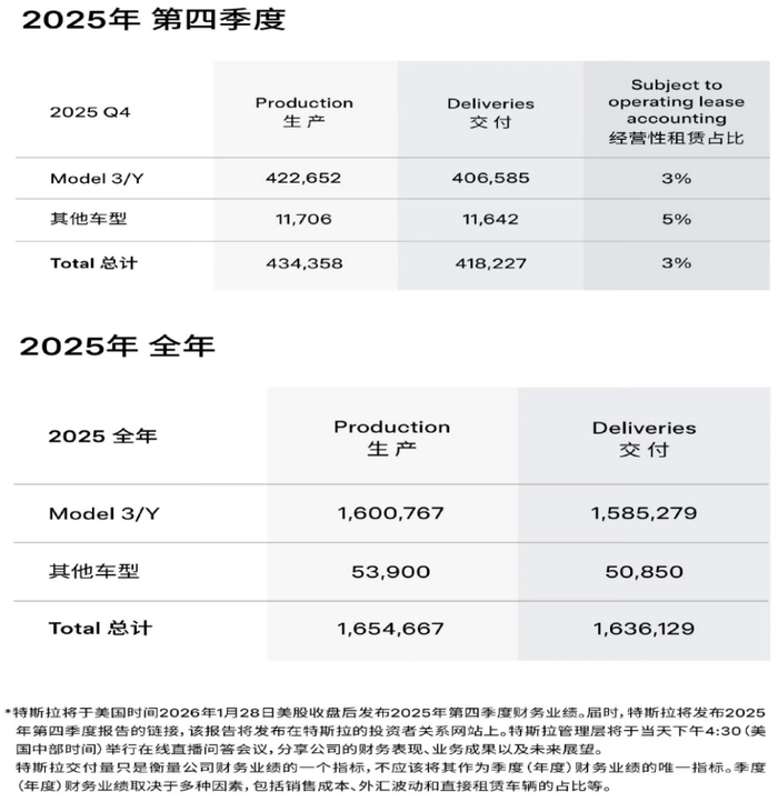 分车型来看,特斯拉Model 3和Model Y两大主力车型2025年全年产量和交付量分别为1600767辆和1585279辆,销量同比下降了7%。包括Model S和Model X等在内的其他车型2025年全年交付量分别为53900辆和50850辆,较2024年全年(产量为85133辆、交付量为85133辆)均有大幅下滑。