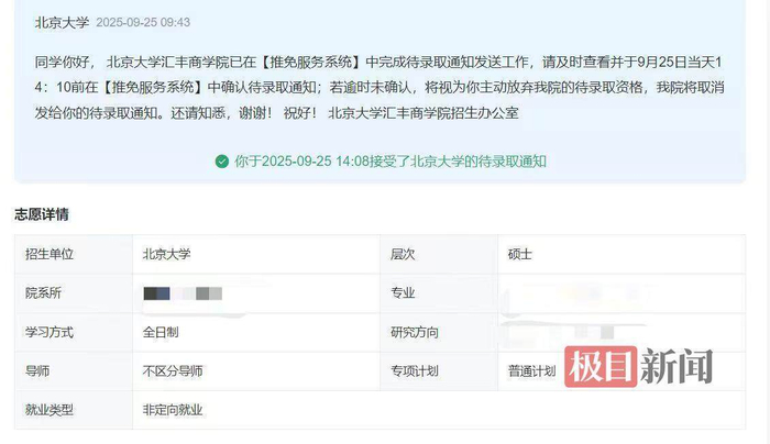 “其实在申请的时候,我觉得自己能申请上复旦大学或者上海交通大学就已经很好了,是最后的时候想着自己冲一把试试看。”2025年9月25日,萱萱收到了来自北京大学汇丰商学院拟录取的通知。
