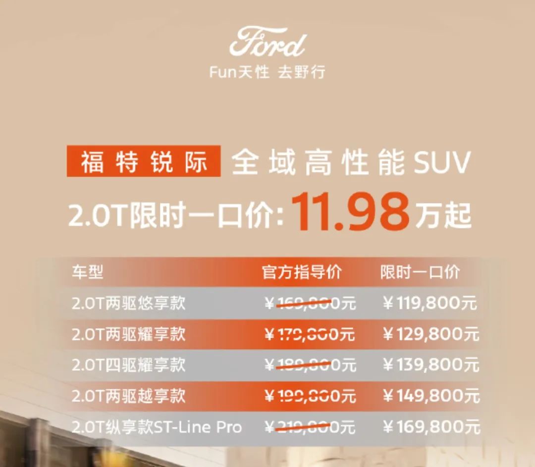 锐际刚在3月推出了一口价活动,11.98万起,这还能说什么呢?只能是真香了,朋友们这可是2.0T+8AT的动力组合呀,这台发动机也曾获得过世界十佳,功率245马力、扭矩393牛米,7.5秒的零百加速,前后轻量化铝合金悬架,簧下质量轻,操控也就能更凌厉,所以在一众家用SUV里,它确实称得上“性能钢炮”了,对驾驶乐趣有要求的朋友选它很合适。