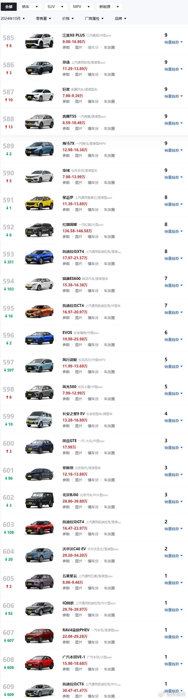 我前一篇文章,写的是10月份销量排行榜的前10名,这一次我们“不走寻常路”,就来看一下销量排行榜比较靠后的位置,到底有多靠后呢?就是那些销量不到10台的车型。我数了一下,发现竟有25款之多,而且既有燃油汽车,又有新能源汽车,既有国产品牌,又有合资品牌,还有豪华品牌,林林总总,五花八门。