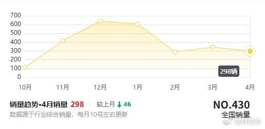 可是在销量方面,这款车却一言难尽,它在今年1-4月份的销量分别为608台、289台、344台和298台,它一年的总销量还没有奥迪A6L(配置|询价)一个月的销量高。