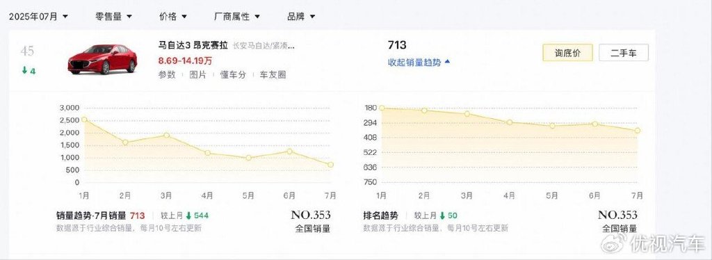 也就难怪,即使目前国内马自达3昂克赛拉在终端的最低价格已经来到了9万以内,但7月份它的销量数据却仍只有713辆新车进账。说白了,现在的国人买车肯定还是懂车的,至此也不禁让我们想问:马自达对待中国市场,何时能像对待北美市场一样如此地“热忱”和“殷勤”呢?恐怕,在我们有生之年都很难看到了吧,大家觉得呢?评论区里留言说说看。(文/优视汽车 大卓 )