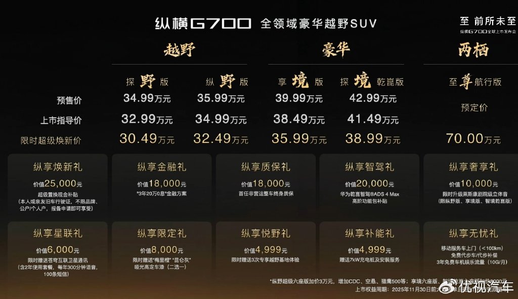 作为一款采用非承载架构的电驱硬派越野SUV车型,捷途纵横G700(配置|询价)终于正式上市了。新车售价32.99万元起,限时超级焕新价30.49万起,相比此前预售的34.99-42.99万元价格区间,整体还是要便宜不少的。而如此一来,也就让它拥有了比坦克500 Hi4-T、方程豹豹8(配置|询价)等车更为出色的性价比。