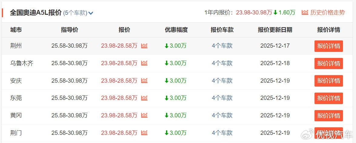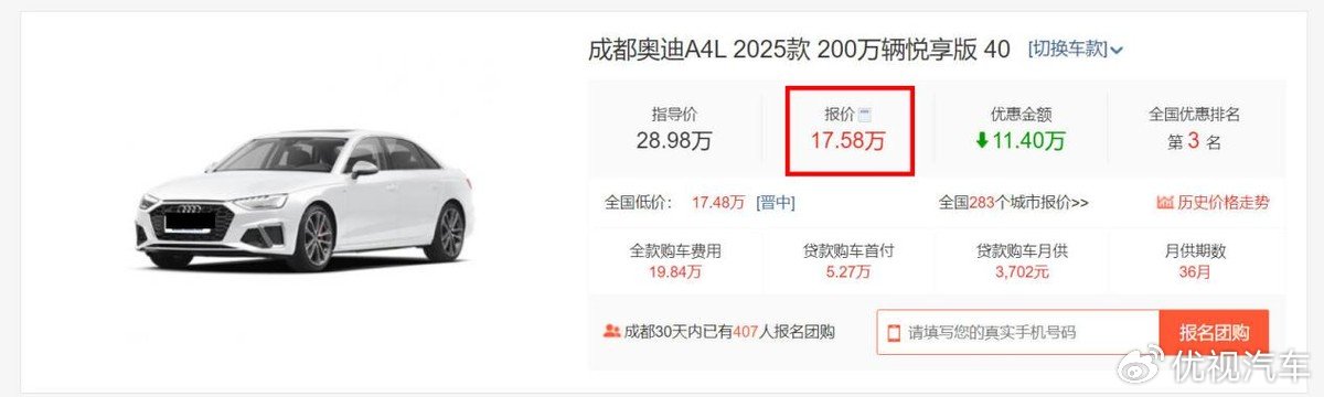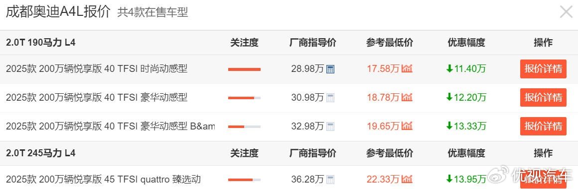 就以成都地区为例,原价28.98万元的奥迪A4L 2025款 200万辆悦享版 40TFSI 时尚动感型,现在经销商参考最低价仅为17.58万,终端优惠幅度高达11.4万。等于说新车直接优惠了40个点,打6折在销售。