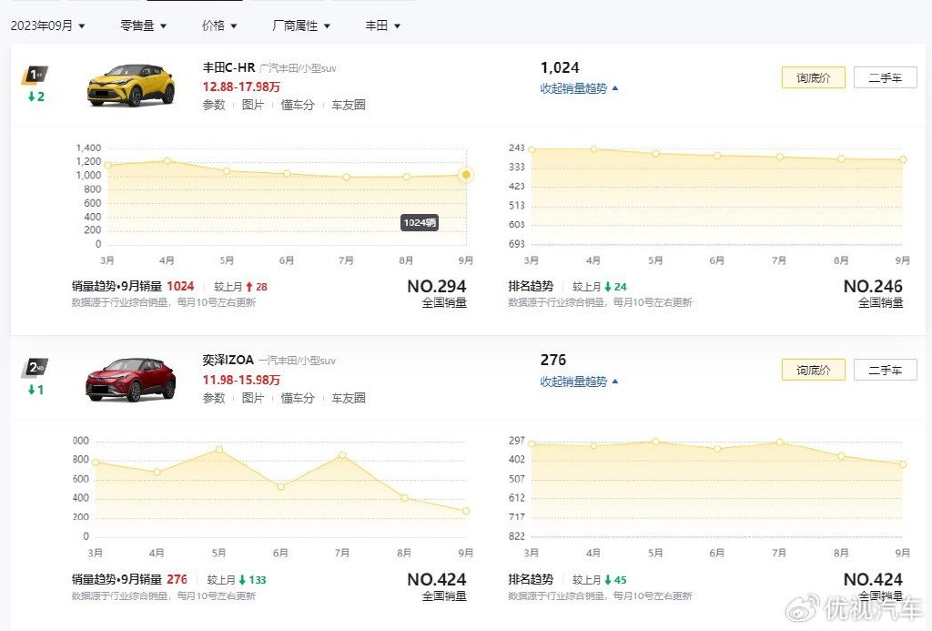 不过,从刚过去的9月销量数据表现来看,广汽丰田C-HR卖出去了1024辆,而一汽丰田奕泽IZOA则仅卖出去了276辆,可见,全球化的命名对车型销量影响还是蛮大的。