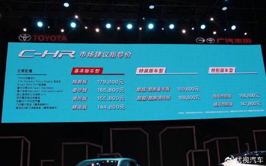 在国内,广汽丰田C-HR最早上市时共推出了8款车型,而指导价格区间则为14.48-17.98万元。同样,隔壁的一汽丰田也推出了C-HR兄弟车型“奕泽IZOA”,而其售价区间则为14.98-17.58万元,相比C-HR起售价略高。