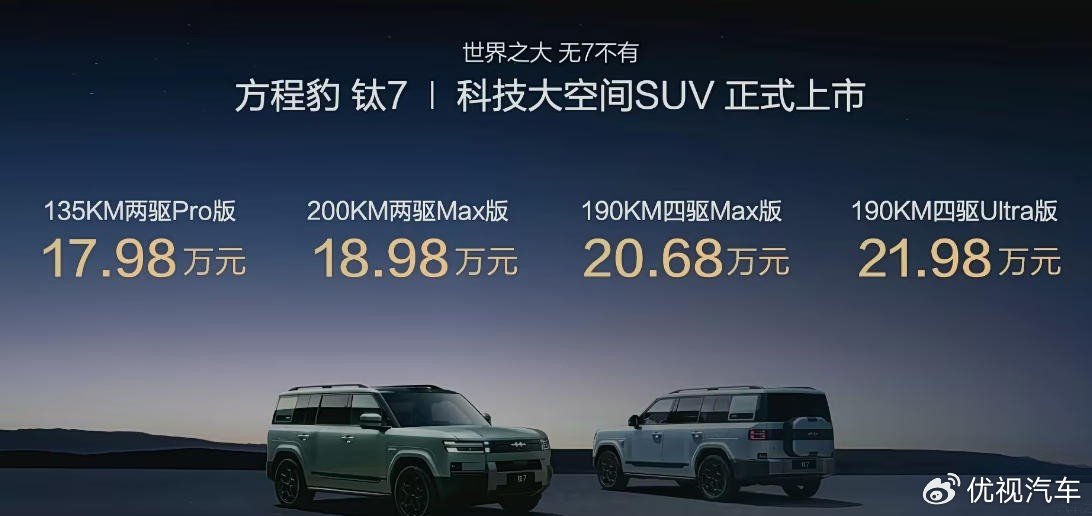 总言之,在我看来,方程豹钛7的爆款逻辑其实很简单。有一个好看的硬派方盒子外观、配上一个实惠的价格,再辅以近乎“入门即满配”的配置,最后再集其低油耗、强动力、四驱系统这样的配备,那大卖这不就稳妥了,而目前的事实也证明了这点,不是吗?(文/优视汽车 大卓 )