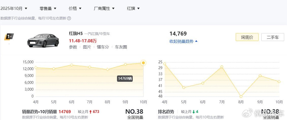 最后,如果此次曝光的全新红旗H5真是纯电版,那其大概率就是会使用单电机和双电机的动力系统了。至于续航,若新车是15万以内的售价,那么起步应该在500-600km左右。倘若真是这价格和续航水平,你们觉得这台红旗H5纯电版能竞争地过小鹏MONA(配置|询价) M03、深蓝L06(配置|询价)这样的新兴车型吗?评论区里留言说说看。(文/优视汽车 大卓 )