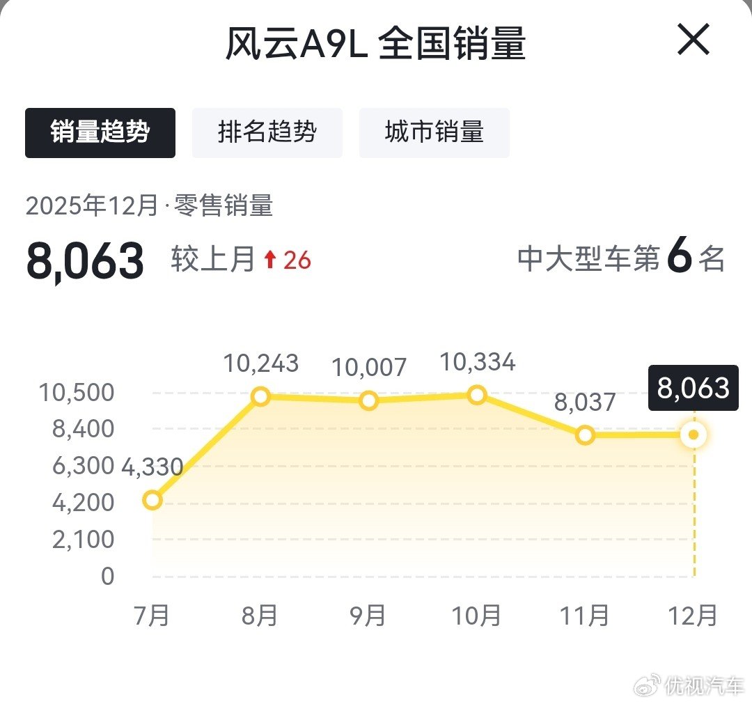 而来到当下,虽说在12月份风云A9L只售出去了8063辆新车,不如8、9、10月销量表现那般强势和亮眼,但总归也是保持住了原先80%左右的销量势头。因此,风云A9L能不能持续热销,我觉得咱们都先别急着下结论,索性让子弹再飞一会儿。