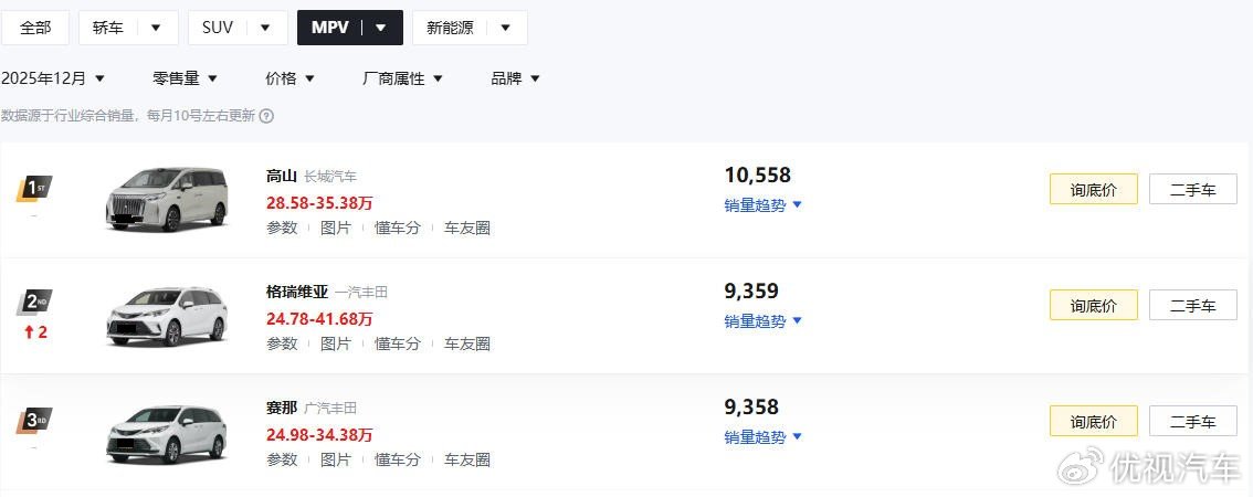 说实话,在2025年12月的MPV销量榜里,一汽丰田格瑞维亚与广汽丰田赛那还能分别交出9359辆和9358辆新车的销量成绩单,这表现确实还是挺不错的。要知道,就算是丰田赛那优惠完以后的最低价,其也还是需要25万的价格才能买,那这么一算下来,落地至少也就奔着30万去了。因此,眼下手握30万预算买MPV,丰田赛那和格瑞维亚的确就是不少人心中认为相对偏稳妥的选择。