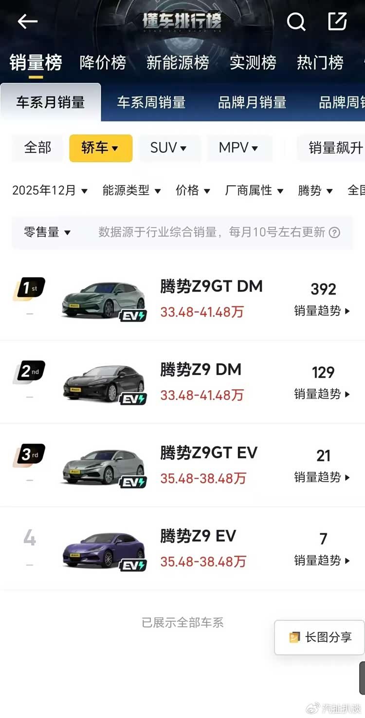 腾势Z9的销量表现呈现明显波动。从历史数据看,该车型自2024年12月实现单月销量1120辆的高点后,在2025年上半年销量有所回落,但进入三季度呈现企稳迹象,整个下半年都是月销500台左右的成绩,对比小米SU7等热销轿车,腾势Z9系列真的有些拿不出手。
