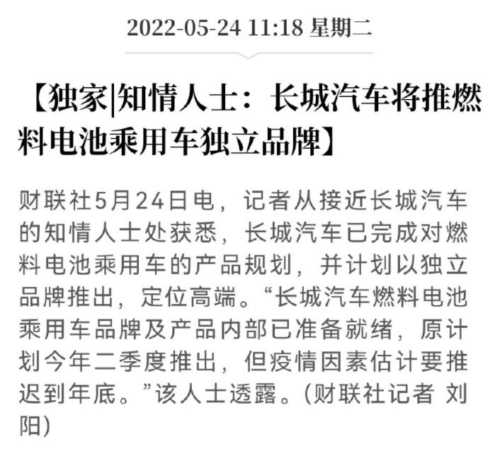 据了解,有知情人士透露长城汽车已经完成对燃料电池乘用车的产品规划,并计划以独立的高端品牌推出。