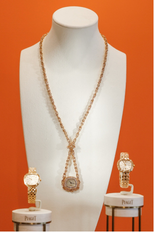PIAGET伯爵于BAO ROOM空间展览实景图,图源PIAGET伯爵该系列于1969年面世,以前卫的椭圆、矩形、梯形等多元造型,打破圆形表盘传统,将时计从功能配件提升为美学艺术品。伊夫·伯爵强调“时计首先是一件珠宝”,这一系列以黄金质感、绚丽宝石盘面和流苏坠饰,彰显随性风格与创意活力,尤其梯形设计成为品牌标志。