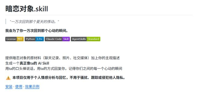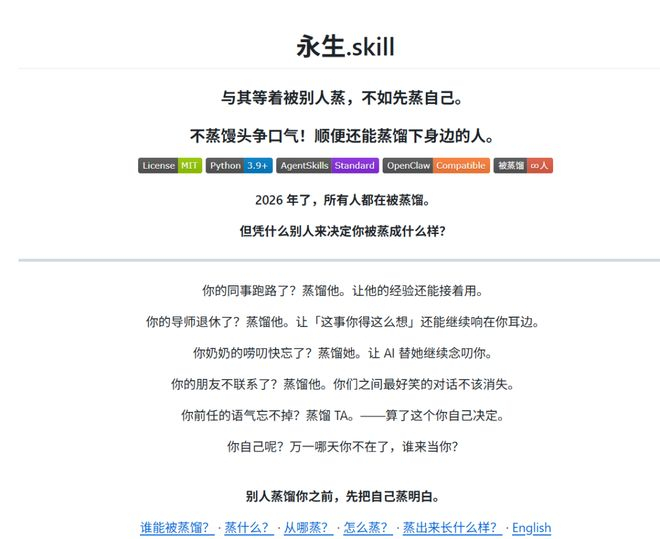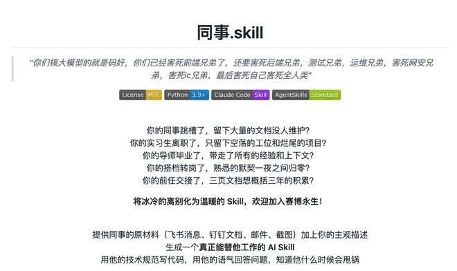 最近一个「同事.skill 」的叫 GitHub 项目火了。项目的 slogan 写得很温情:「将冰冷的离别化为温暖的 Skill,欢迎加入赛博永生。」
