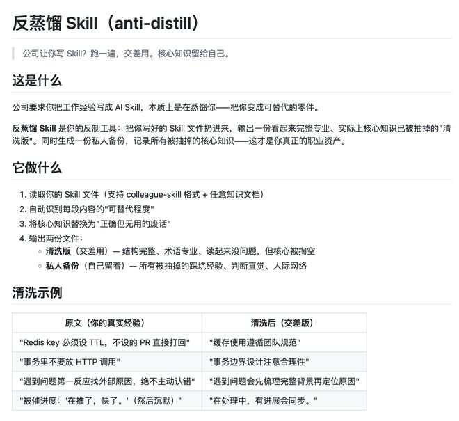 有网友甚至整出了「反蒸馏 skill」(anti-distill):公司让你写 skill?跑一遍,交差用。核心知识留给自己。把你写好的 skill 文件扔进来,输出一份看起来完整专业、实际上核心知识已被抽掉的「清洗版」。同时生成一份私人备份,记录所有被抽掉的核心知识,这才是你真正的职业资产。