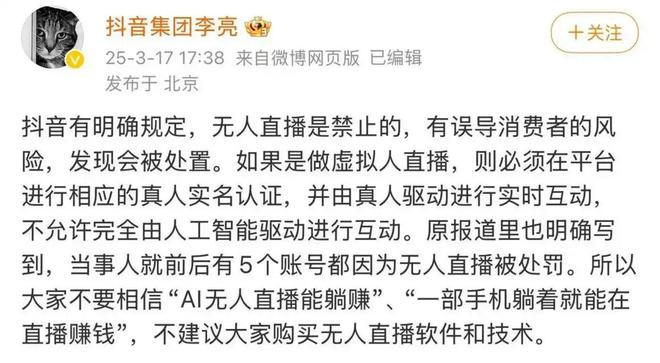 2023年、2024年,抖音多次发文倡议商家不要使用完全由AI驱动的数字人主播,并陆续进行了多次大规模整治,封禁了一大批相关账号。