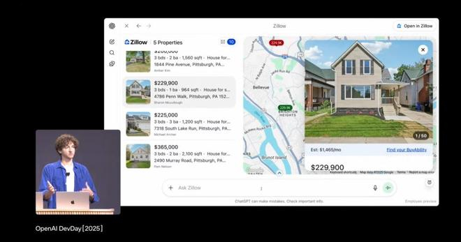 现场演示中,OpenAI 工程师展示了如何在 ChatGPT 中调用 Zillow 的可交互地图,完成房源筛查的任务。用户还可以通过自然语言指令,要求 Spotify 创建一个符合自己品味的播放列表。