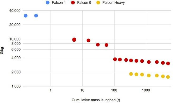 自 Falcon 1 成功发射以来,按通胀调整后的「最低实现价格」统计的 SpaceX 有效载荷发射质量,按不同火箭类别递进展示。请注意,在 Falcon 9 和 Falcon Heavy 火箭出现了显著的价格跃降。