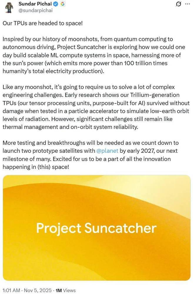11 月 2 日,英伟达首次把 H100 GPU 送入了太空,参阅报道《英伟达发射了首个太空 AI 服务器,H100 已上天》。而刚刚谷歌宣布,他们也要让 TPU 上天。