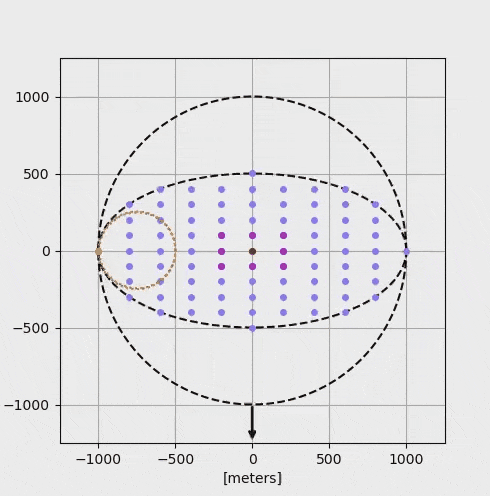 下图展示了一个位于轨道平面内、平均集群高度为 650 公里的 81 颗卫星星座配置示例(在一个完整轨道周期内)的轨迹。集群半径 R=1 公里,在地球引力的影响下,次近邻卫星之间的距离在约 100–200 米之间振荡。